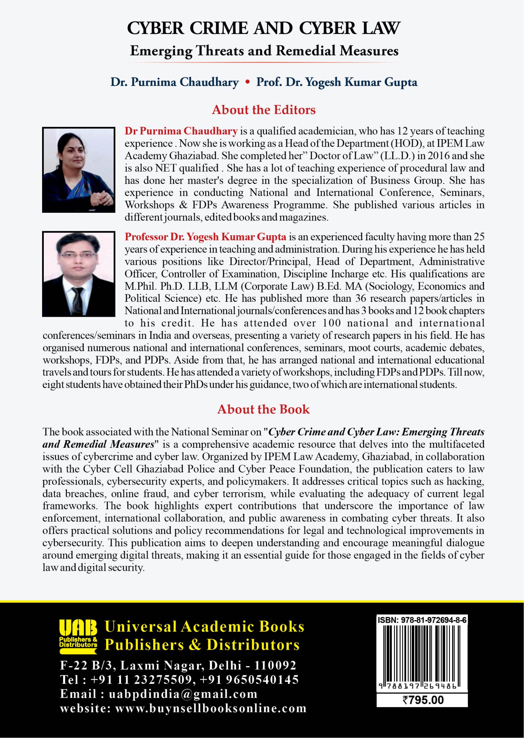 “Cyber Crime and Cyber Law: Emerging Threats and Remedial Measures” is a comprehensive academic resource that delves into the multifaceted issues of cybercrime and cyber law. It addresses critical topics such as hacking, data breaches, online fraud, and cyber terrorism, while evaluating the adequacy of current legal frameworks. The book highlights expert contributions that underscore the importance of law enforcement, international collaboration, and public awareness in combating cyber threats. It also offers practical solutions and policy recommendations for legal and technological improvements in cybersecurity. This publication aims to deepen understanding and encourage meaningful dialogue around emerging digital threats, making it an essential guide for those engaged in the fields of cyber law and digital security.