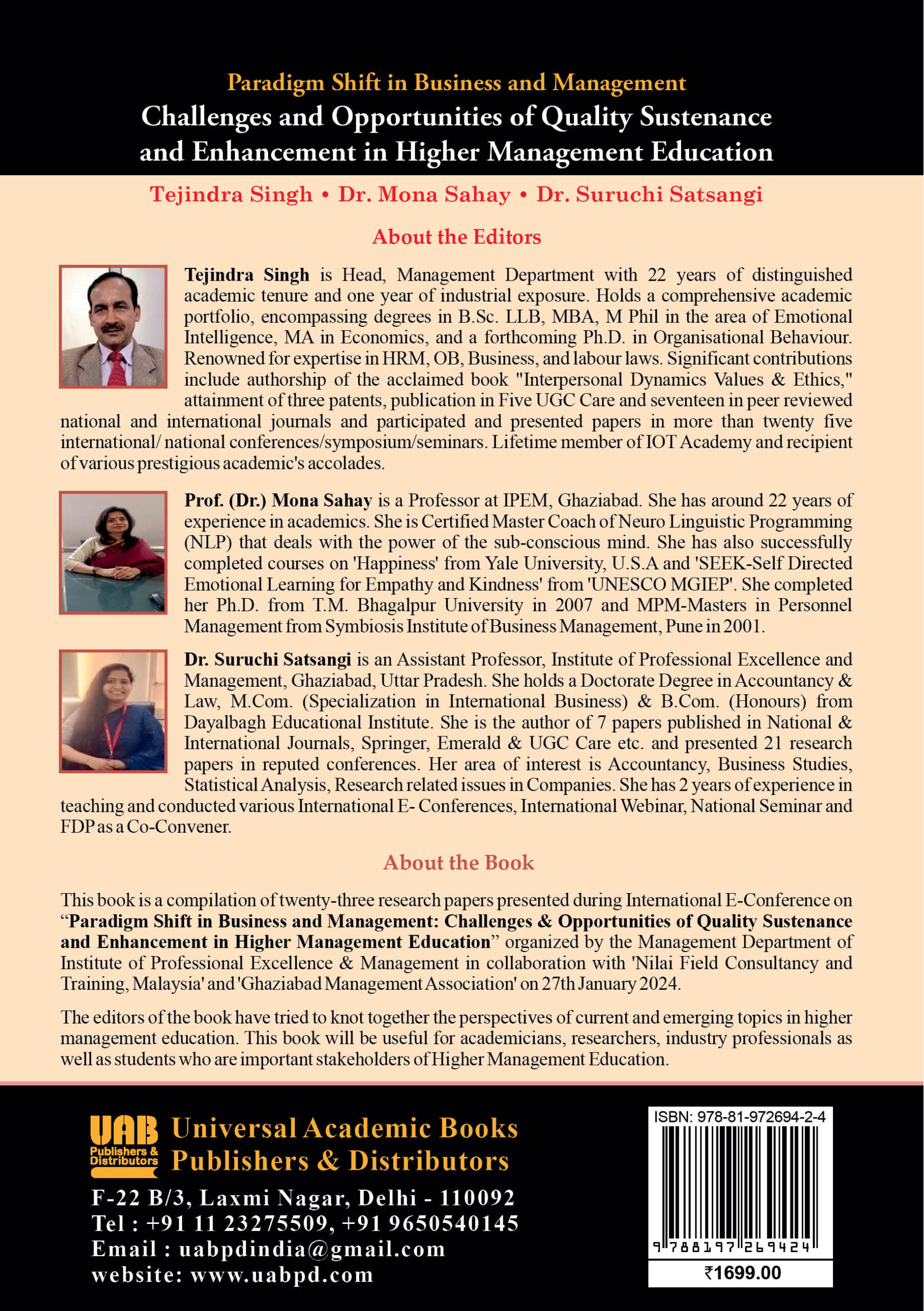 This book is a compilation of twenty-three research papers presented during International E-Conference on “Paradigm Shift in Business and Management: Challenges & Opportunities of Quality Sustenance and Enhancement in Higher Management Education” organized by the Management Department of Institute of Professional Excellence & Management in collaboration with ‘Nilai Field Consultancy and Training, Malaysia’ and ‘Ghaziabad Management Association’ on 27th January 2024. The editors of the book have tried to knot together the perspectives of current and emerging topics in higher management education. This book will be useful for academicians, researchers, industry professionals as well as students who are important stakeholders of Higher Management Education.
